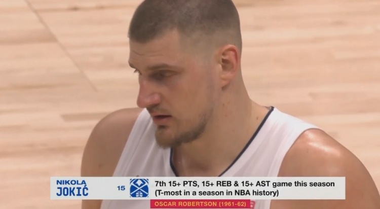 約基奇本季已經(jīng)7次單場(chǎng)至少15分15板15助 追平大O的歷史紀(jì)錄