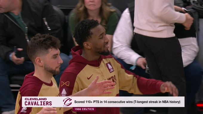 轉(zhuǎn)播方曬出數(shù)據(jù),騎士目前取得14連勝,且這期間他們每場得分都是110+。這也追平了凱爾特人在1985-86賽季保持的NBA歷史紀(jì)錄!