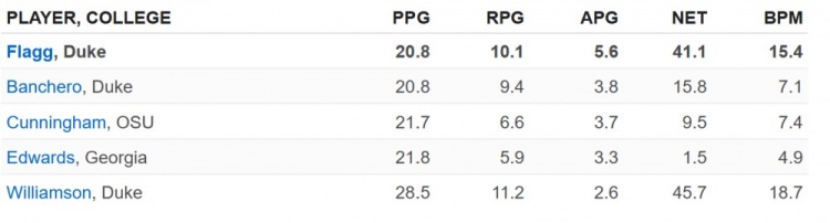 雖然即戰(zhàn)力和發(fā)展?jié)摿κ遣煌木S度,但弗拉格在大學賽場的統(tǒng)治表現(xiàn)同時通過了數(shù)據(jù)驗證與球探肉眼觀察的雙重檢驗,尤其是當將他與NBA球星進行類比時。