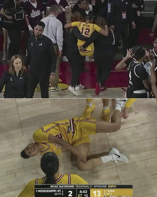 比賽中,南加州大學(xué)王牌朱朱-沃特金斯右膝疑似重傷,被攙扶離場(chǎng)。