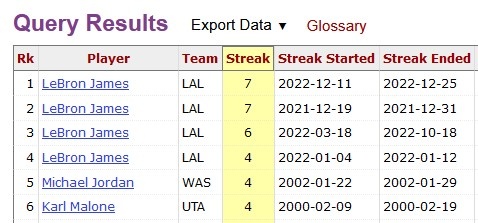 詹姆斯(4次,最多連續(xù)7場(chǎng)),喬丹、馬龍。