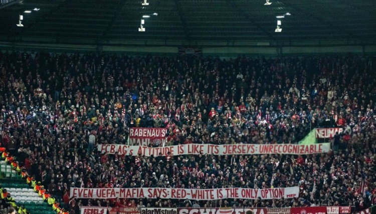 拜仁因?qū)Ρ榷葐栴}無法在歐冠穿主場(chǎng)球衣,球迷橫幅呼吁用白色號(hào)碼