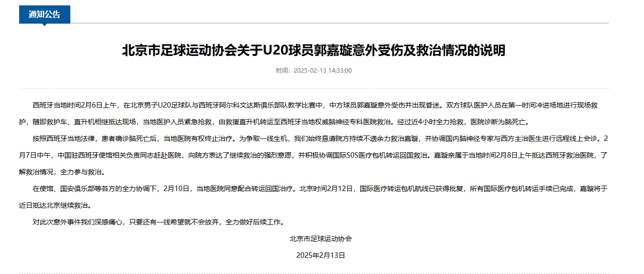 西班牙當?shù)貢r間2月6日上午,在北京男子U20足球隊與西班牙阿爾科文達斯俱樂部隊教學比賽中,中方球員郭嘉璇意外受傷并出現(xiàn)昏迷。雙方球隊醫(yī)護人員在第一時間沖進場地進行現(xiàn)場救護,隨即救護車、直升機相繼抵達現(xiàn)場,當?shù)蒯t(yī)護人員緊急搶救,由救援直升機轉(zhuǎn)運至西班牙當?shù)貦?quán)威腦神經(jīng)??漆t(yī)院救治。經(jīng)過近4小時全力搶救,醫(yī)院診斷為腦死亡。