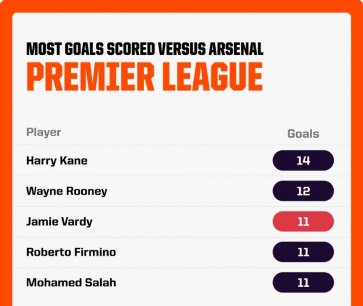 據(jù)Opta統(tǒng)計,萊斯特城前鋒瓦爾迪英超對陣阿森納打進11球,槍手是被他破門最多的球隊,賽事歷史上僅少于凱恩和魯尼。