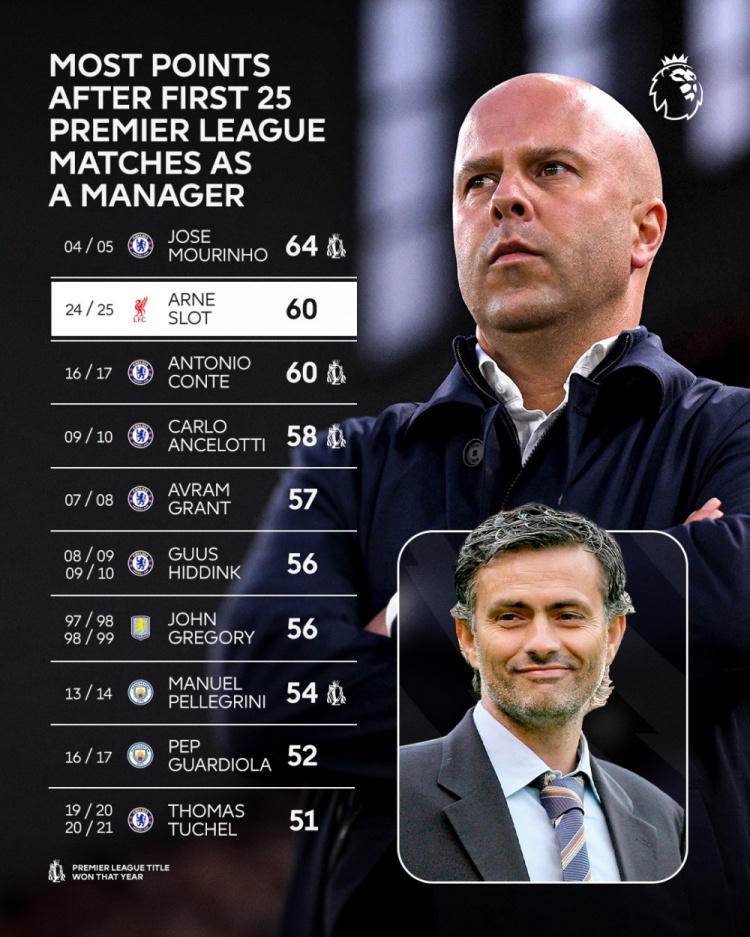 執(zhí)教英超前25場積分:穆帥64分最多,斯洛特60分次席&瓜帥52分