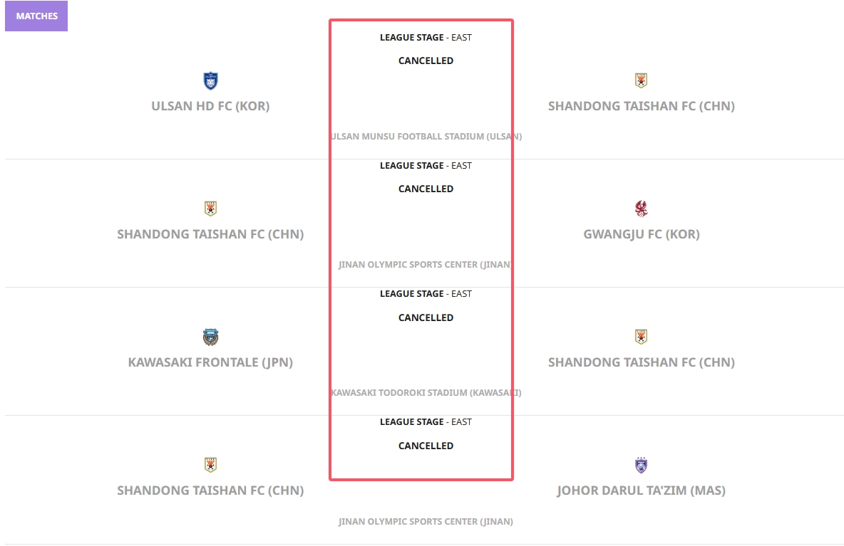 亞足聯(lián)官網(wǎng)顯示:山東泰山8場(chǎng)亞冠全部“取消”!積分榜數(shù)據(jù)清零