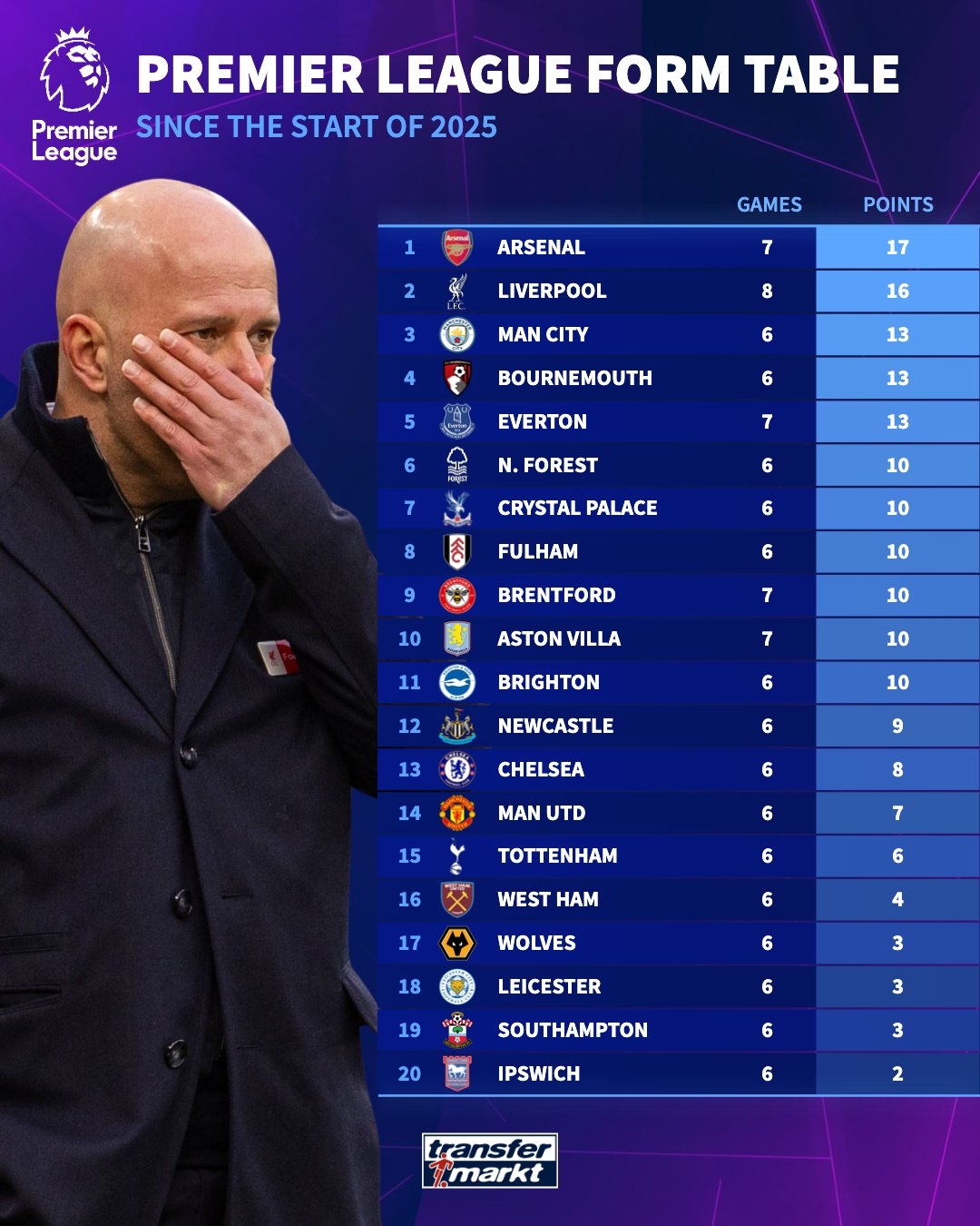 2月20日訊 德國轉(zhuǎn)會(huì)市場統(tǒng)計(jì)了2025年開始至今英超球隊(duì)拿到的積分,并列出榜單,阿森納17分居首,利物浦16分次席。