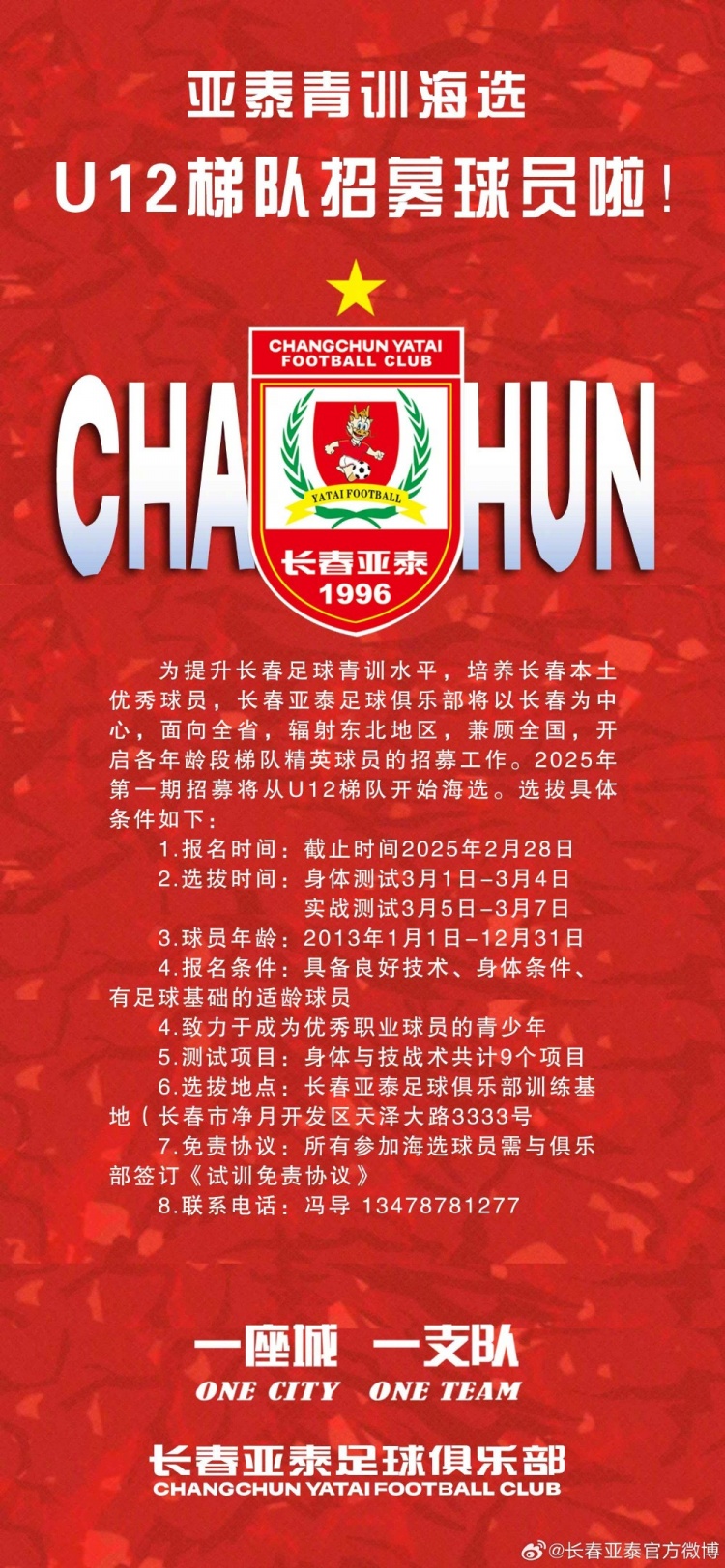 為了可持續(xù)發(fā)展戰(zhàn)略,完善俱樂部梯隊建設(shè),長春亞泰足球俱樂部將立足本土,以長春為中心,面向全省,輻射東北地區(qū),兼顧全國,開啟各年齡段梯隊精英球員的招募工作。2025年第一期招募將從U12梯隊開始海選。