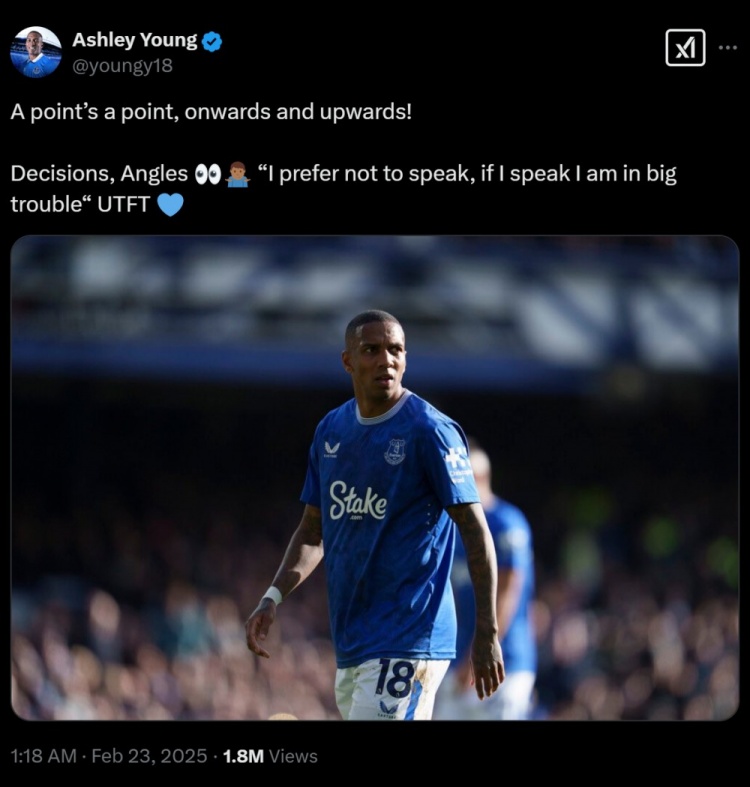 2月23日訊 本輪英超比賽中,埃弗頓2-2戰(zhàn)平曼聯(lián)。比賽尾聲階段,阿什利-揚(yáng)在德里赫特和馬奎爾的包夾下倒地,裁判最初判罰點(diǎn)球,但在場邊觀看VAR后取消。賽后,阿什利-揚(yáng)更新社媒,引用了穆帥的名言,似乎是對判罰不滿。