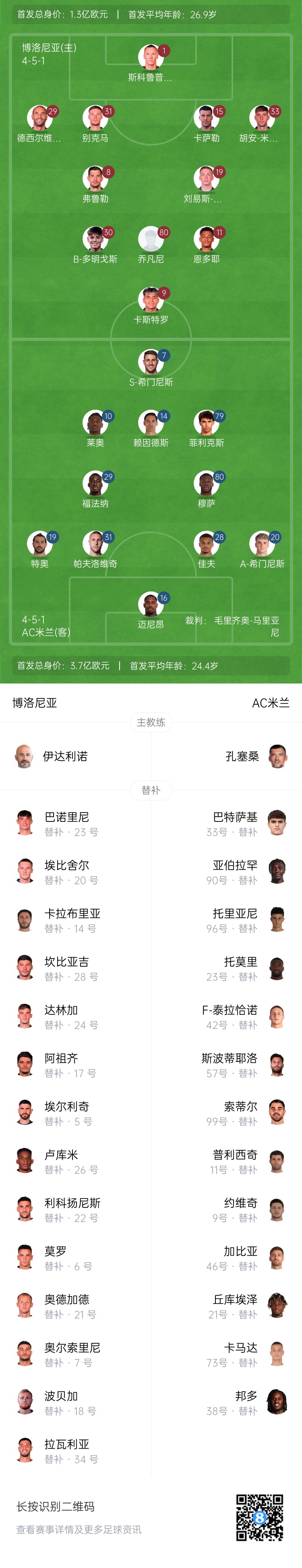 博洛尼亞替補:23-巴諾里尼、34-拉瓦利亞、5-埃爾利奇、14-伊令、22-利科揚尼斯、26-盧庫米、6-莫羅、17-阿祖齊、18-波貝加、20-埃比舍爾、7-奧爾索里尼、21-奧德加德、24-達(dá)林加、28-坎比亞吉