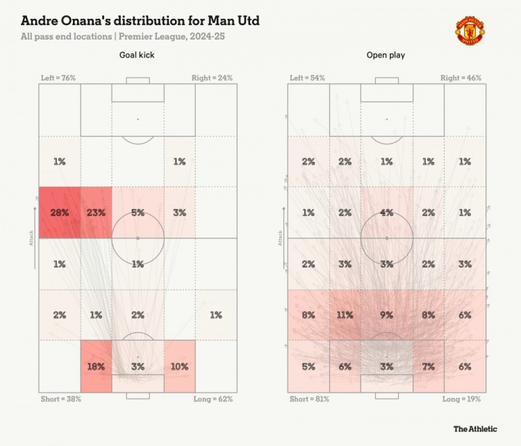 問題似乎在進(jìn)攻組織的早期階段就已經(jīng)出現(xiàn),從奧納納開始就是如此。曼聯(lián)似乎還沒有找到他最適合的出球方式——盡管現(xiàn)在有點兒趨勢了。本賽季,無論是在滕哈赫,還是在阿莫林麾下,奧納納經(jīng)常會采用長傳球的方式出球,如下圖所示。