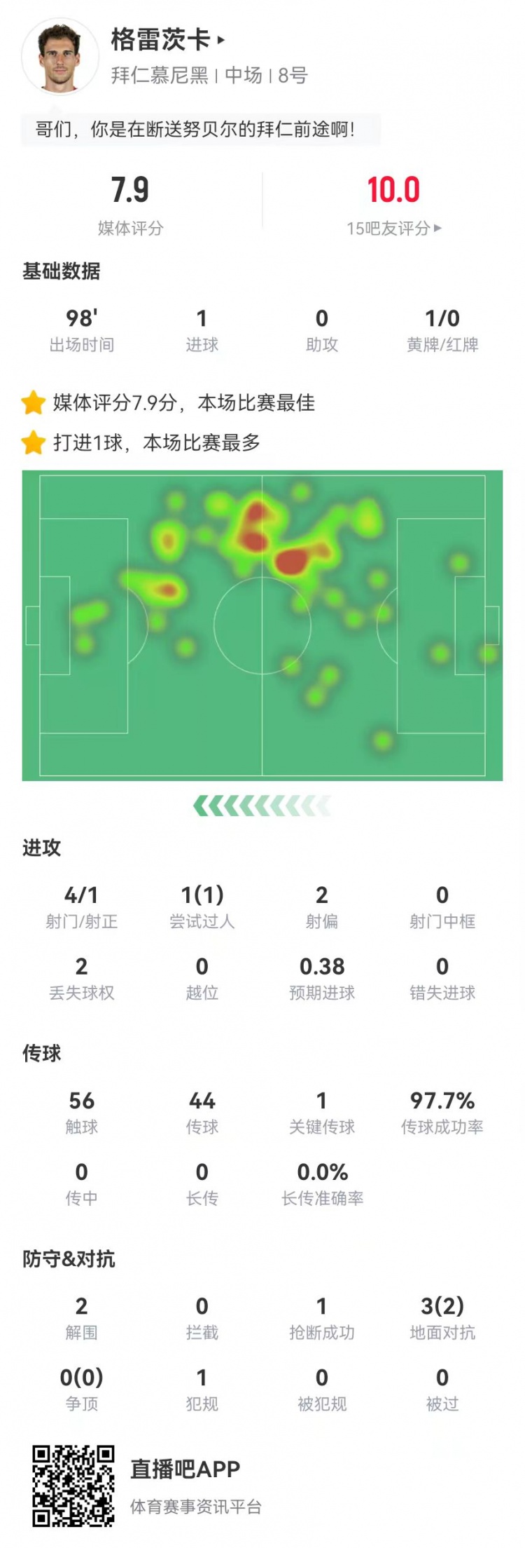 格雷茨卡本場1球+1關(guān)鍵傳球 44傳球43成功 獲評7.9分全場最高