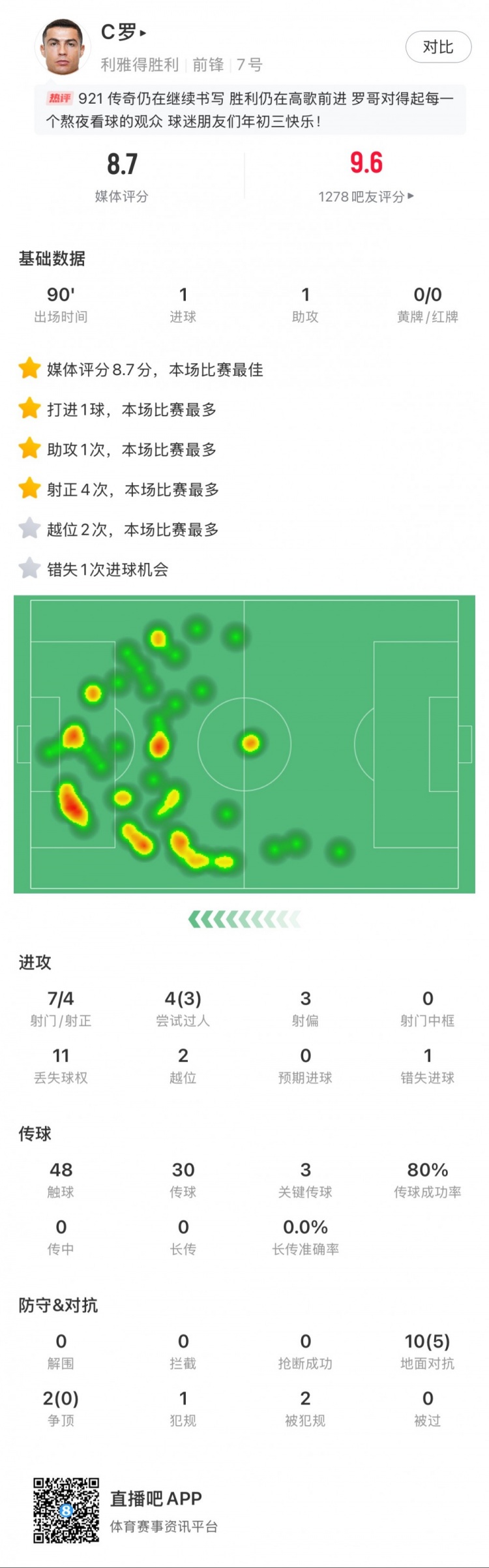 C羅全場數(shù)據(jù):1球1助,7射4正,3次關鍵傳球,獲評8.7分最高