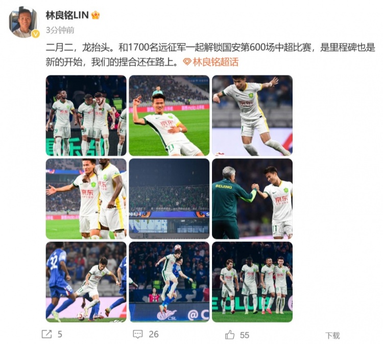 在個(gè)人社媒,林良銘曬出與申花比賽的相關(guān)圖片,并配文:二月二,龍?zhí)ь^。和1700名遠(yuǎn)征軍一起解鎖國(guó)安第600場(chǎng)中超比賽,是里程碑也是新的開始,我們的捏合還在路上。