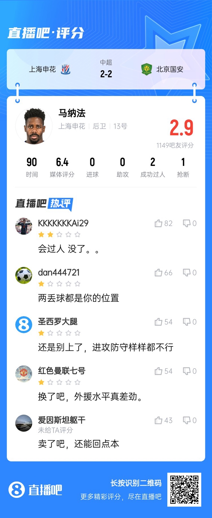 昨晚的京滬德比中,申花右后衛(wèi)馬納法與兩粒丟球都有關(guān)系。補(bǔ)時階段沒能防住李磊,后者強(qiáng)行起球助攻阿布雷烏完成絕平。