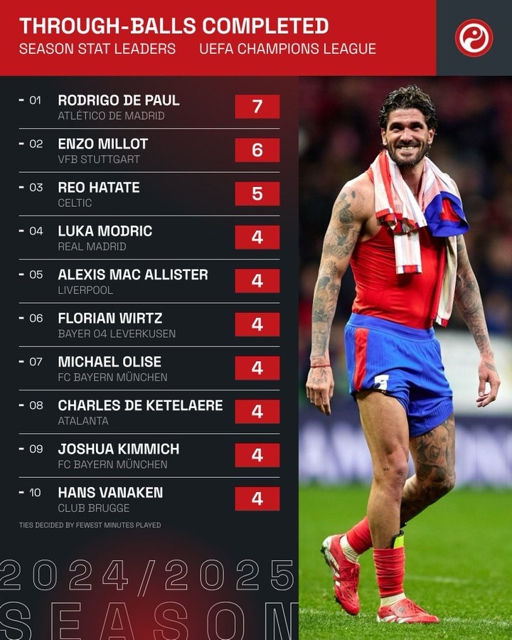 本賽季歐冠精準(zhǔn)直塞榜:德保羅居首,魔笛、麥卡、維爾茨在列