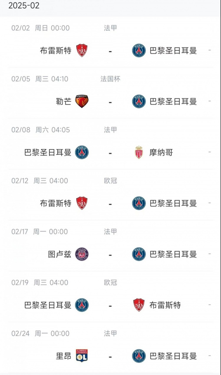 巴黎2月份將3次對(duì)陣布雷斯特,分別是2月2日0點(diǎn)法甲客戰(zhàn)布雷斯特,2月12日4點(diǎn)歐冠淘汰賽附加賽首回合客戰(zhàn)布雷斯特,2月19日4點(diǎn)次回合主場(chǎng)對(duì)陣布雷斯特。