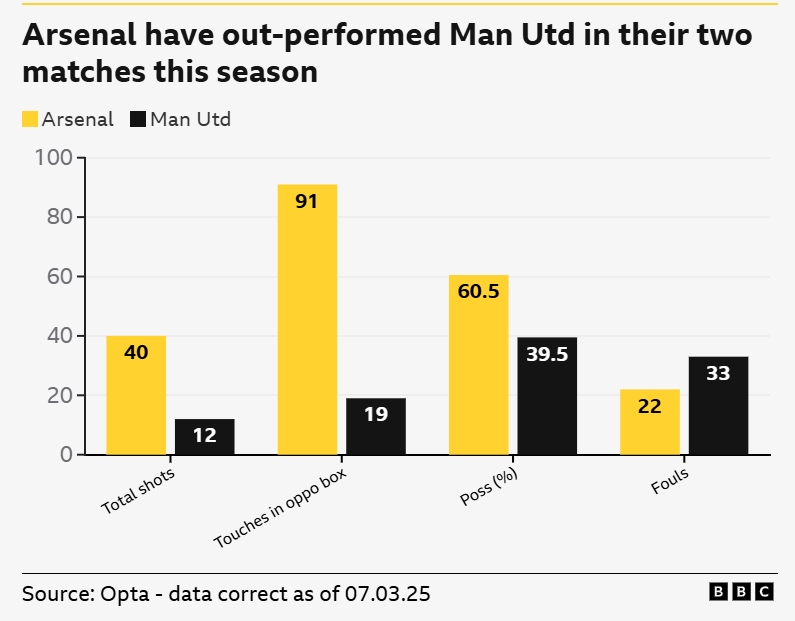 曼聯(lián)vs阿森納今夜再度上演,BBC賽前列出本賽季兩隊此前交手時的關(guān)鍵數(shù)據(jù),槍手占據(jù)壓倒性優(yōu)勢。