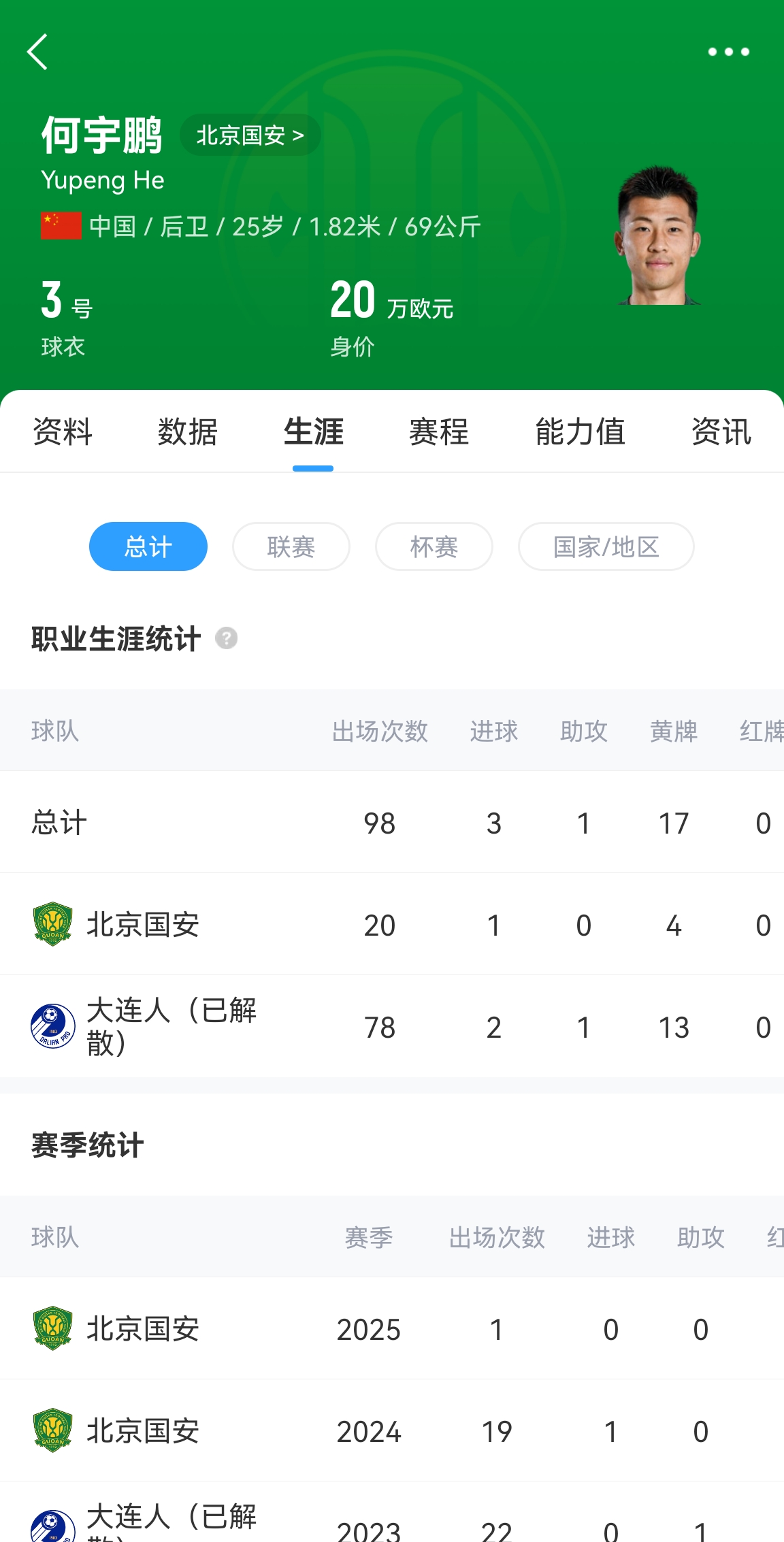 何宇鵬現(xiàn)年25歲,2024年加盟北京國(guó)安,本賽季前2輪中超為國(guó)安出戰(zhàn)1次。
