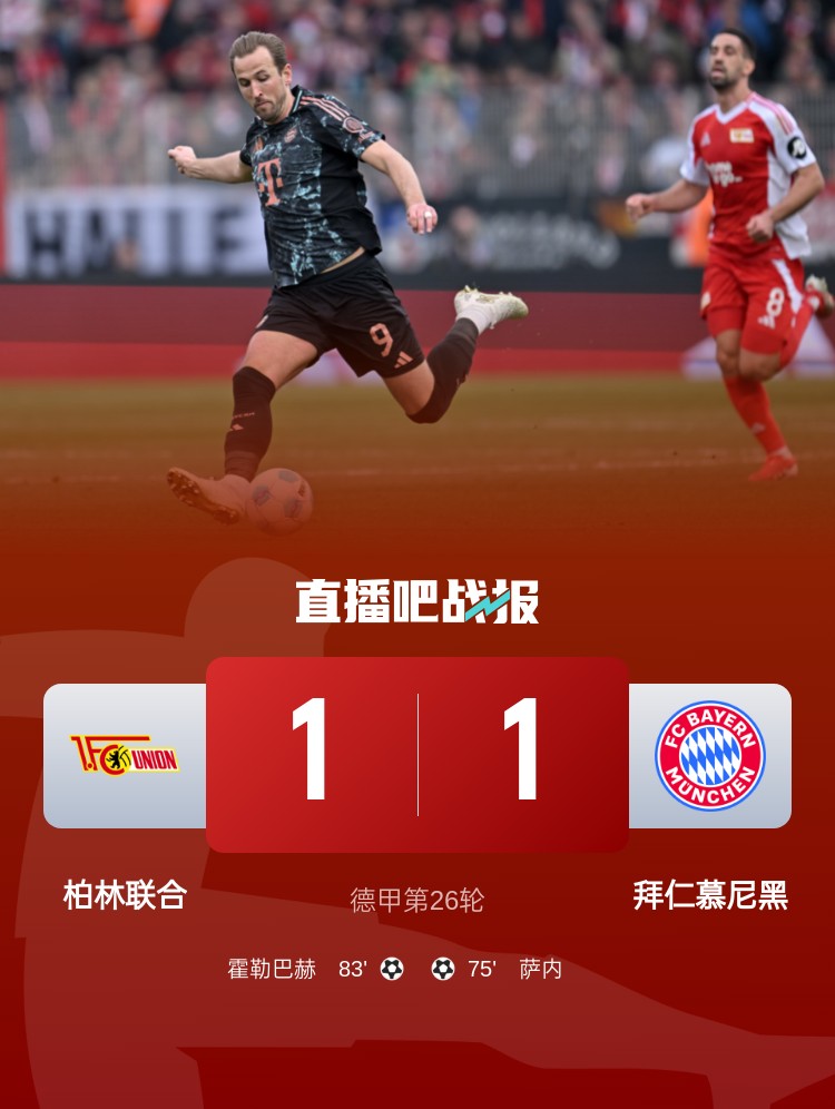 德甲第26輪,拜仁客場1-1柏林聯(lián)合,薩內(nèi)替補(bǔ)建功,烏爾比希失誤。