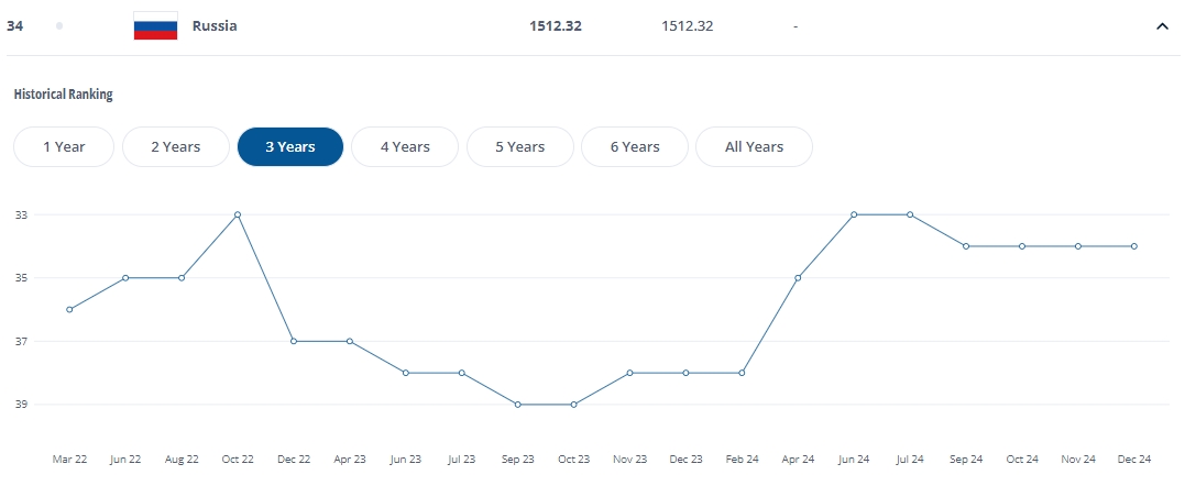 過(guò)去3年俄羅斯FIFA排名變化