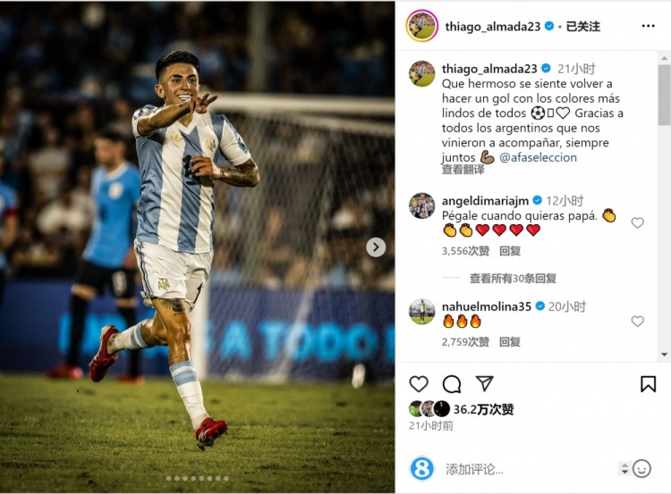 阿爾馬達(dá)社媒曬出自己慶祝進(jìn)球的照片,配文:“身穿最美麗的球衣再次進(jìn)球的感覺是多么美妙,感謝所有來支持我們的阿根廷球迷,永遠(yuǎn)團(tuán)結(jié)一致?!?/p>