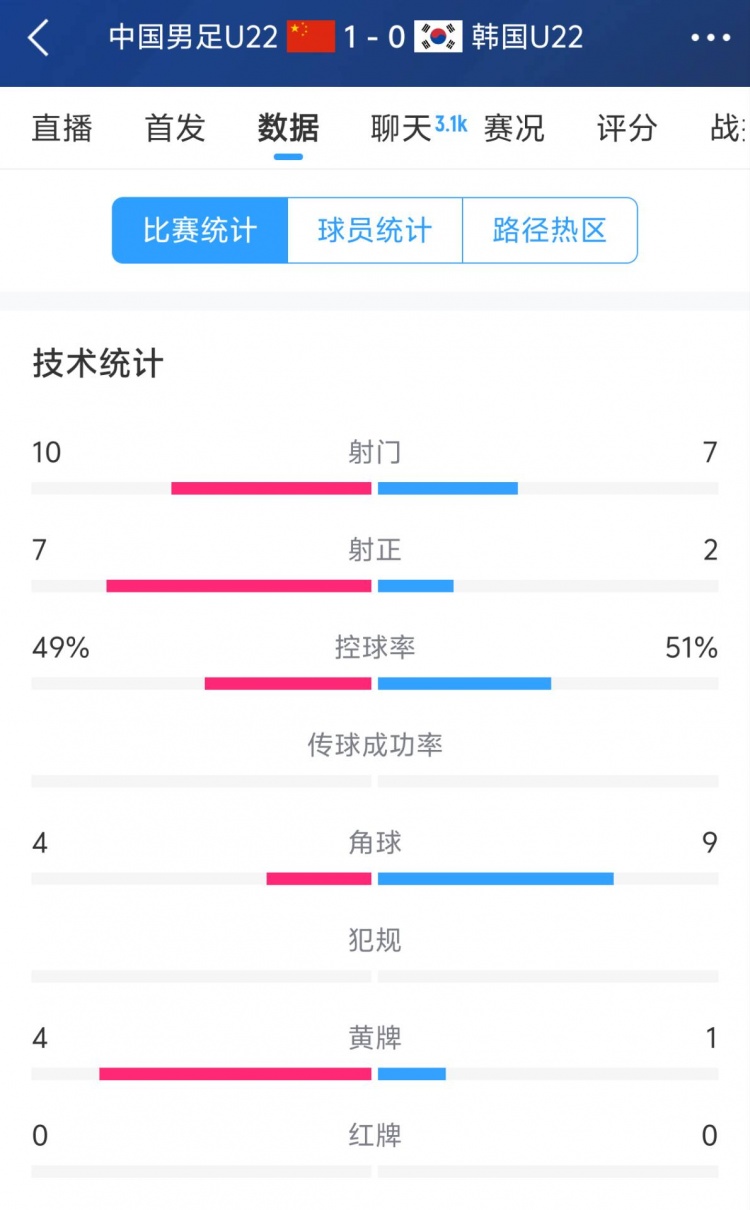 本場(chǎng)數(shù)據(jù)方面,中國(guó)隊(duì)控球率49%,韓國(guó)51%。射門方面,中國(guó)隊(duì)10次射門7次射正,韓國(guó)隊(duì)7次射門2次射正。