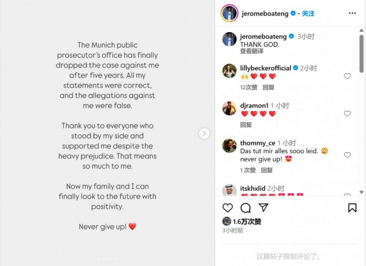 3月27日訊 博阿滕更新社媒,慶賀針對(duì)他的家暴指控被撤銷。