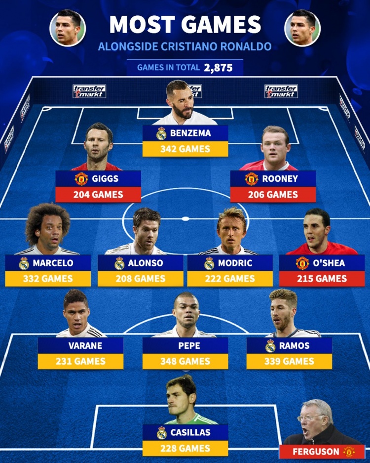 和C羅一起出場最多隊(duì)友陣:魔笛本澤馬在列,魯尼吉格斯兩翼齊飛