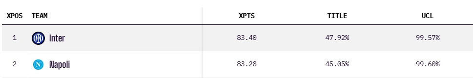 機構(gòu)演算數(shù)據(jù)顯示,國米本賽季意甲奪冠概率為47.9%,比目前排名榜首的那不勒斯高出近3個百分點,那不勒斯奪冠概率為45%,機構(gòu)預(yù)測兩隊季末都是83個積分收官。